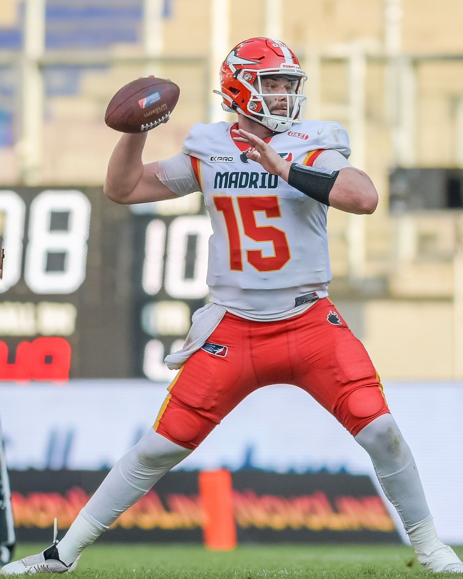 Steven Duncan (Madrid Bravos, #15), Rhein Fire vs Madrid Bravos, American Football, European League of Football, Wildcard round, Season 2024, 01.09.2024, Foto: Foot Bowl/JUST SHOTS