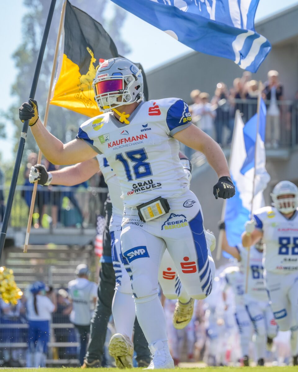 The Wilddogs not only celebrated their premiere in the Erima GFL, but also a successful start to the season. The Kramski-Arena was well maintained and the club and the team were well prepared. A colorful program for the whole family, musically accompanied by the Fanfarenzug Bretten and the Europafanfare Karlsruhe, created a festive atmosphere. The pre-game show began at 15:30 and kick-off was at 16:00. The anticipation was great and there was a large crowd by GFL standards. The main stand was full, certainly sold out1.