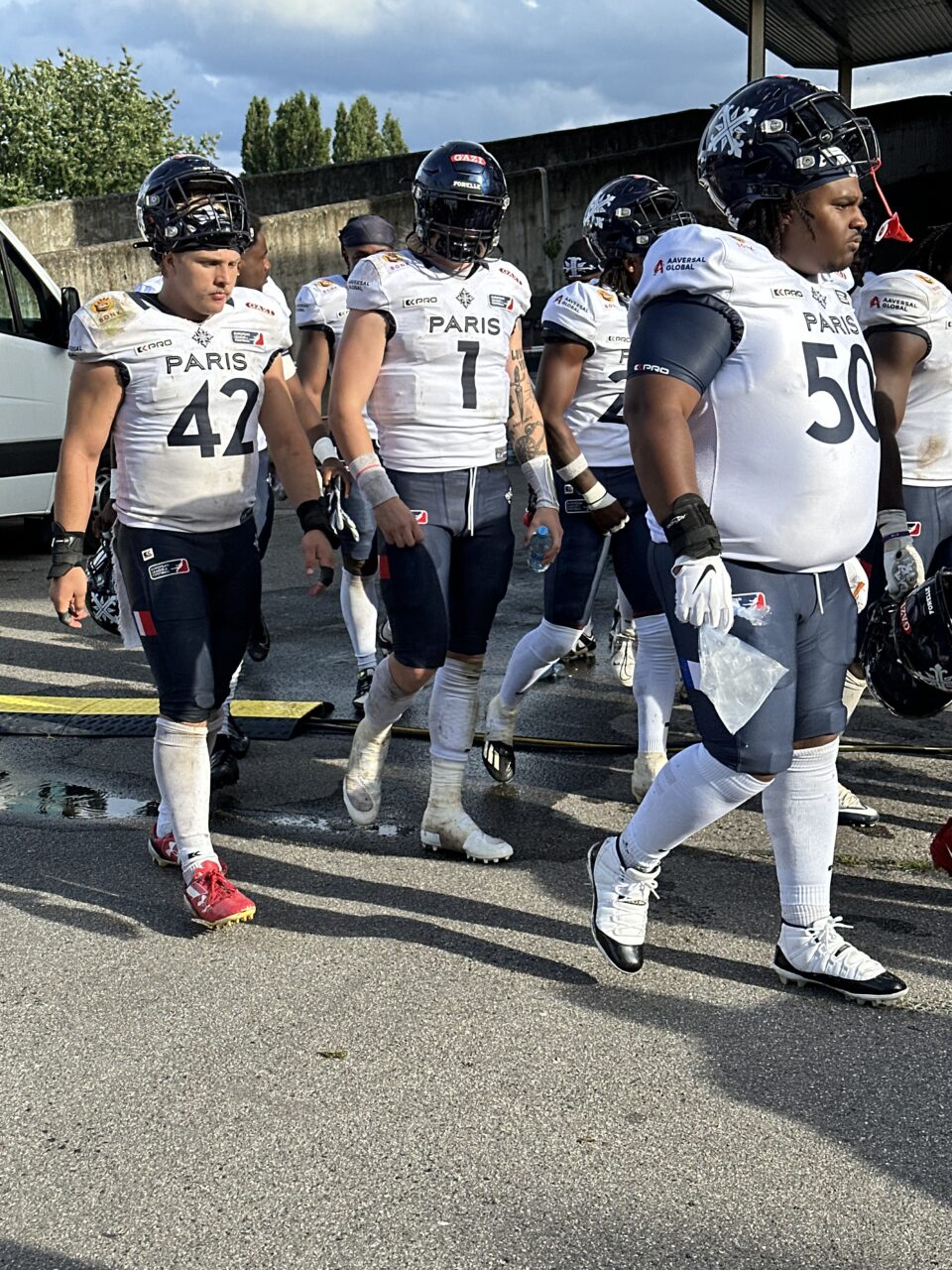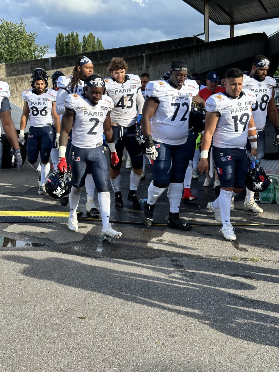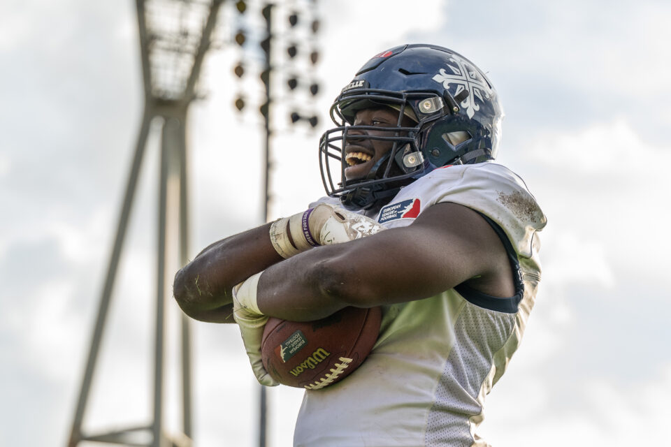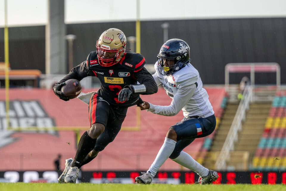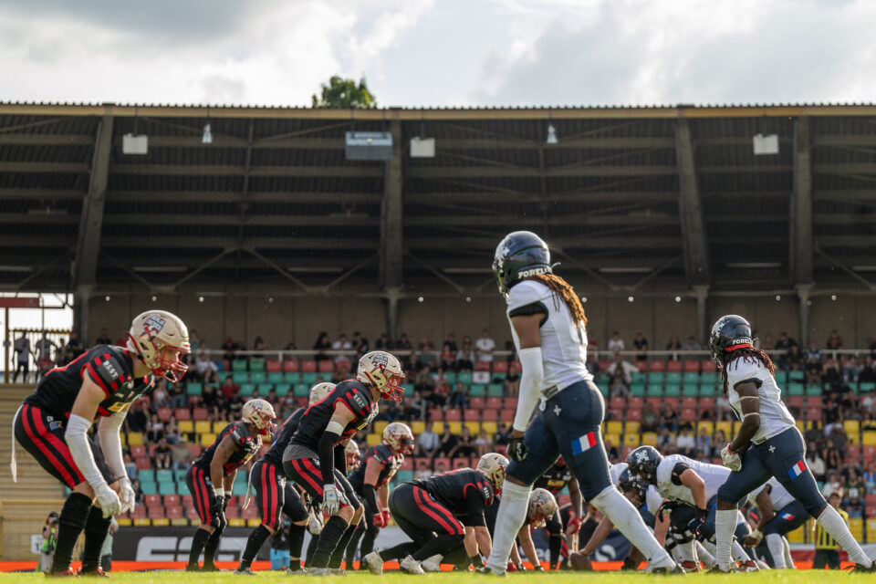 What can you say about it? The stadium was certainly a respectable sports venue in the past. Nowadays, however, it is more of a ruin and an imposition to host competitions at international level. The visitors used the porta-potties that were set up outside. The visiting team could be found in the intermediate corridor behind the stadium during the break, as the “changing room” is a little way away in a school complex. There the Musketeers were, sitting on the loading area of the broadcast trucks, holding their halftime meeting. It had been raining heavily that day. The tunnels into the inner area were more like Venetian waterways than paths. Wooden beams were laid out so that you could at least get into the inner area with reasonably dry feet. However, this was only possible through one of the two entrances anyway. Most of the already modest power party had already been dismantled by then. In addition, there is not just one lane around the stadium, there is practically an entire area around the pitch. So the 200 spectators had to watch the action from 50m away. When we collected our accreditation, we couldn’t be found on the list. We were told to simply write our names on it so that we could then receive our neon yellow photographer’s vest. All in all, I’m very happy that the stadium has finally come to an end. Unfortunately, there doesn’t seem to be a solution yet that’s anywhere near as good. I can only hope that the city of Berlin will not only invest in the NFL, but that some of the non-existent money will also flow into local sport. It would definitely be sustainable.