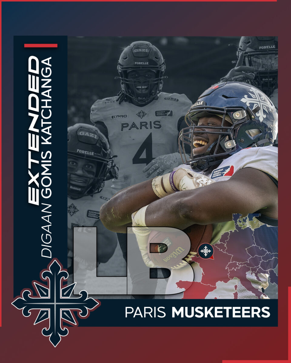 Paris Musketeers4 Digaan Gomis Katchanga by roman.just-shots1. January 199722. February 20250325 Share0 Jaylon HendersonLamonte McDougleWidmael PetionKevin FortesWadjihe SaidNyohor BadianeElyes SaouiElton. MendesMax GayeJordy AdjeteyJean AubertWally-Molla CamaraNabil MarzouguiSouleymane Karamoko3. Amir Kilani4. Digaan Gomis Katchanga6. Austin Mitchell12. Hugo Tekedam13. Florian Larose14. Cheikhou Sow29. Kevin Querido Dias35. Paul Veritas36. Maxime Roger40. Kadel King44. Stanley Zeregbe45. Chris Voumbo55. Mamadou Sy63. Lewis Thomas65. Jeremy Gasparro75. Laic Vontie #4NameDigaan Gomis KatchangaNationalitySenegalFrancePositionLinebackerHeight184cmWeight102kgCurrent TeamPast TeamsLeaguesEuropean League of FootballSeasons2023, 2024, 2025Age28