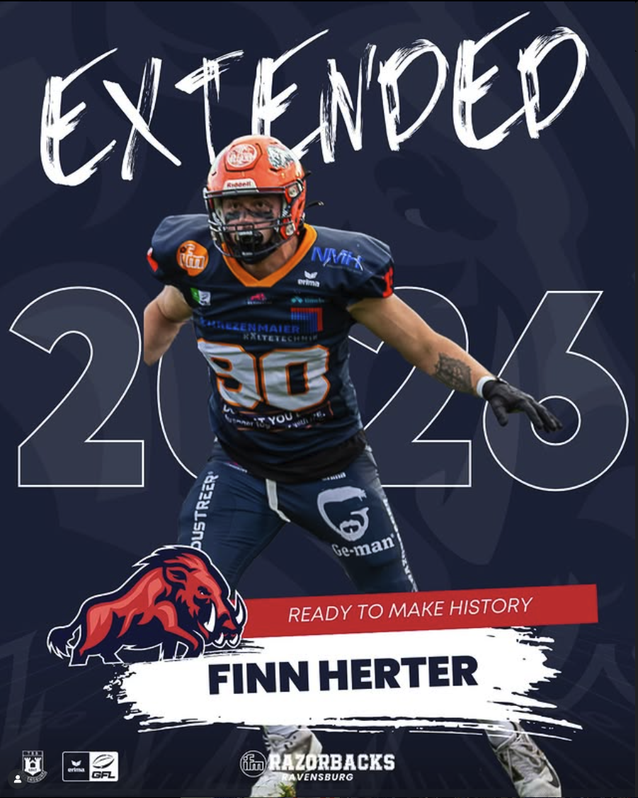 Finn Herter is a prime example of successful homegrown talent and a vital cornerstone of the ifm Razorbacks Ravensburg defense. Born in Ravensburg, Herter began his journey with the club in the Flag Football youth system in late 2014 and has been an integral part of the organization ever since. Now a commanding Defensive End, he has developed into a constant presence on the defensive line, crucial for both setting the edge against the run and generating pressure on opposing quarterbacks. Herter’s athleticism, high football IQ, and powerful presence have made him a central component of the Razorbacks’ success in the GFL. His deep loyalty to the club is evident, leading him to extend his contract through the 2026 season and solidifying his role as a leader and mentor for the next generation of Razorbacks.