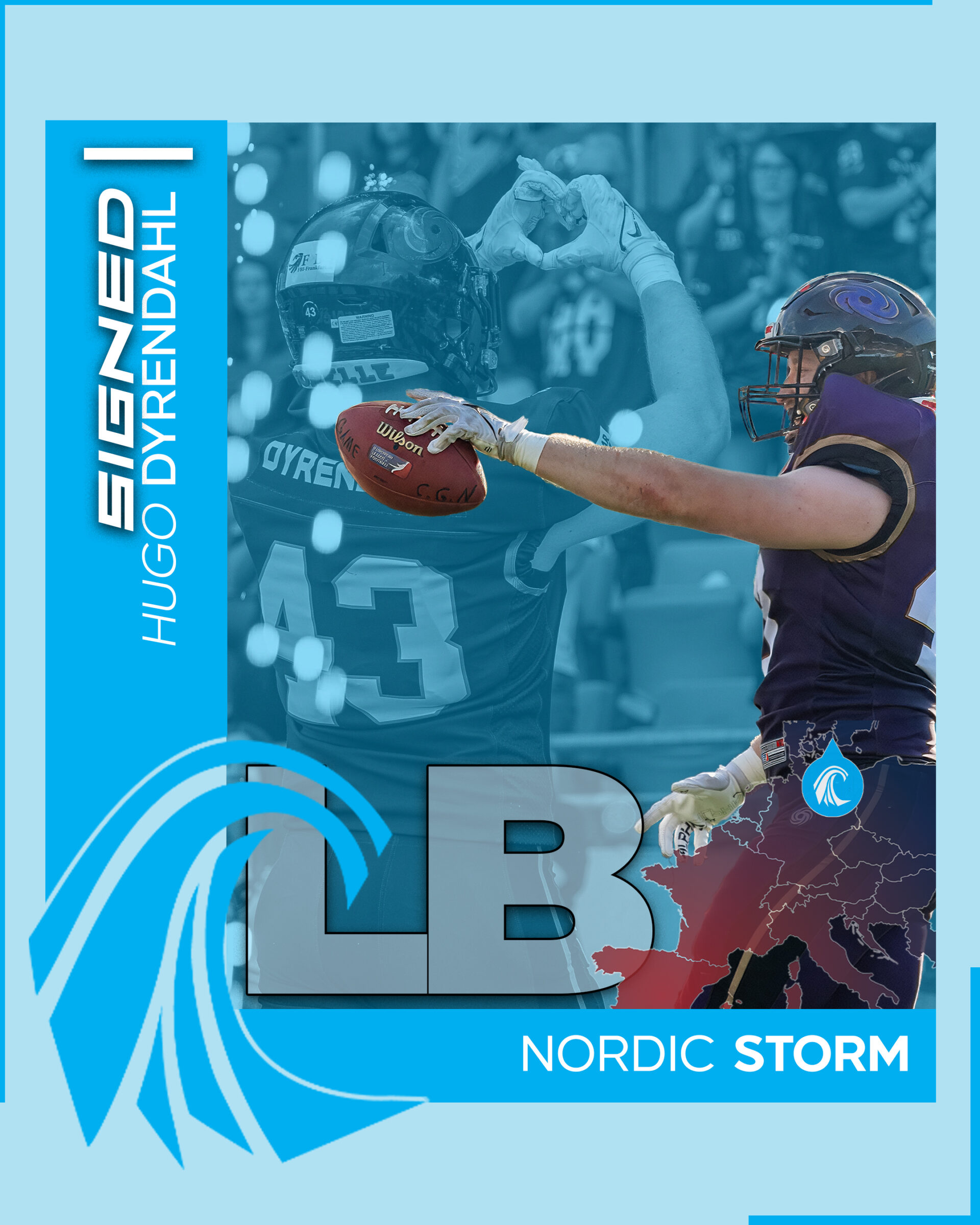 Hugo Dyrendahl is a Swedish linebacker who has played in several top European leagues. With an impressive career that began in 2009, he has received numerous awards, including AFL Tackle Leader and AFL Defense MVP in 2022. He currently plays for the Frankfurt Galaxy in the European League of Football and will play for the Nordic Storm team from 2025.