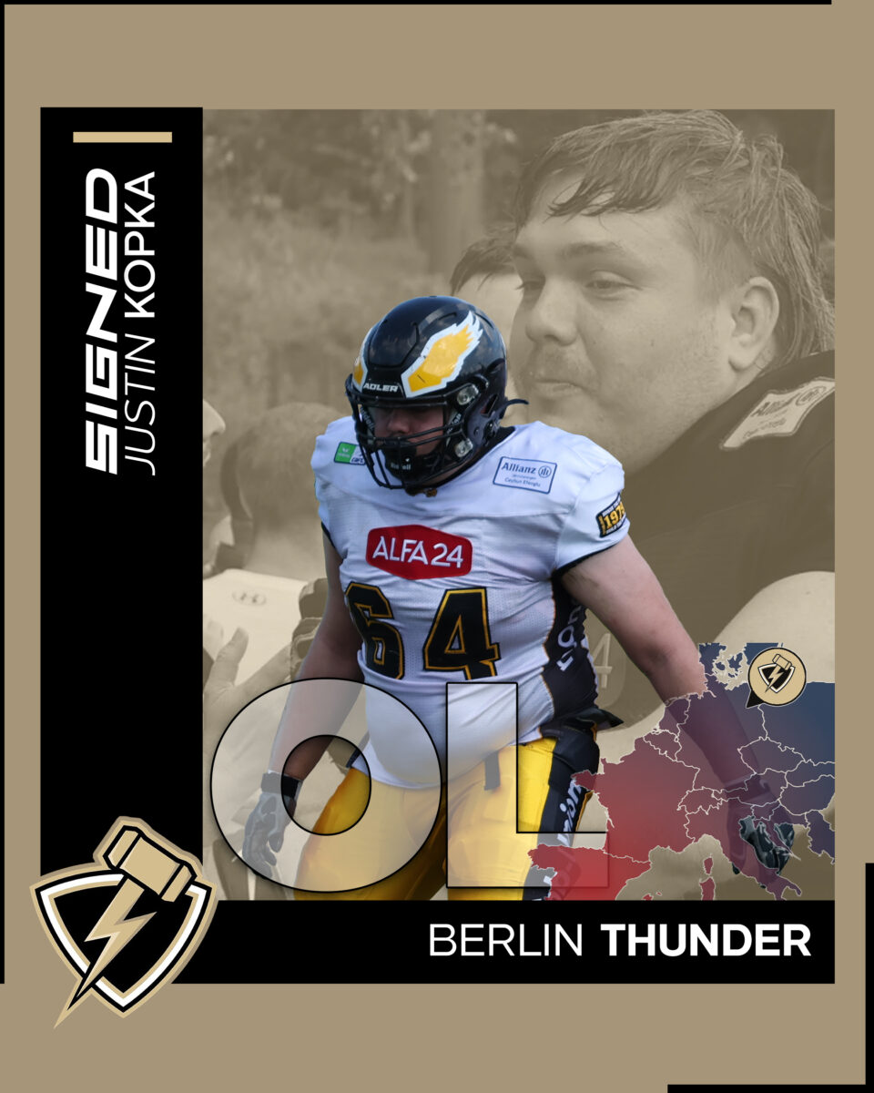 Berlin ThunderJustin Kopka by roman.just-shots1. January 200122. February 20250337 Share0 Foto: Thomas Sobotzki Justin KopkaMarcello Simón Alvarez PlataNeville KrügerFerras El-HendiLondon HarrisBryce GogginTristan GütherNils SchauerteJeremiah Webb3. Bais Kouanda07. Jakeb Sullivan08. Tyler Foster09. Simon Hakes14. Peter Daigeler14. Joshua Poznanski15. Moritz Thiele19. Niklas Schumm19. Jonas Gacek21. Gennadiy Adams22. Félix Proulx23. Courtney Etienne24. Chrisman Kyei24. Emil Fuchs25. Moritz Teuchert41. Giancarlo Boone Jr.44. Rick Baunacke52. Bastian Gersöne53. Niclas Klopsch56. Connor Bolton72. José Ariza81. Niclas Kranz85. Nicolai Schumann90. Ben Baierl96. Giani Versace Pilot98. Fabian Tchuda99. Aaron Große Kleimann99. William Lydle #NameJustin KopkaNationalityGermanyPositionOffensive LineCurrent TeamBerlin ThunderLeaguesEuropean League of FootballSeasons2025Age24