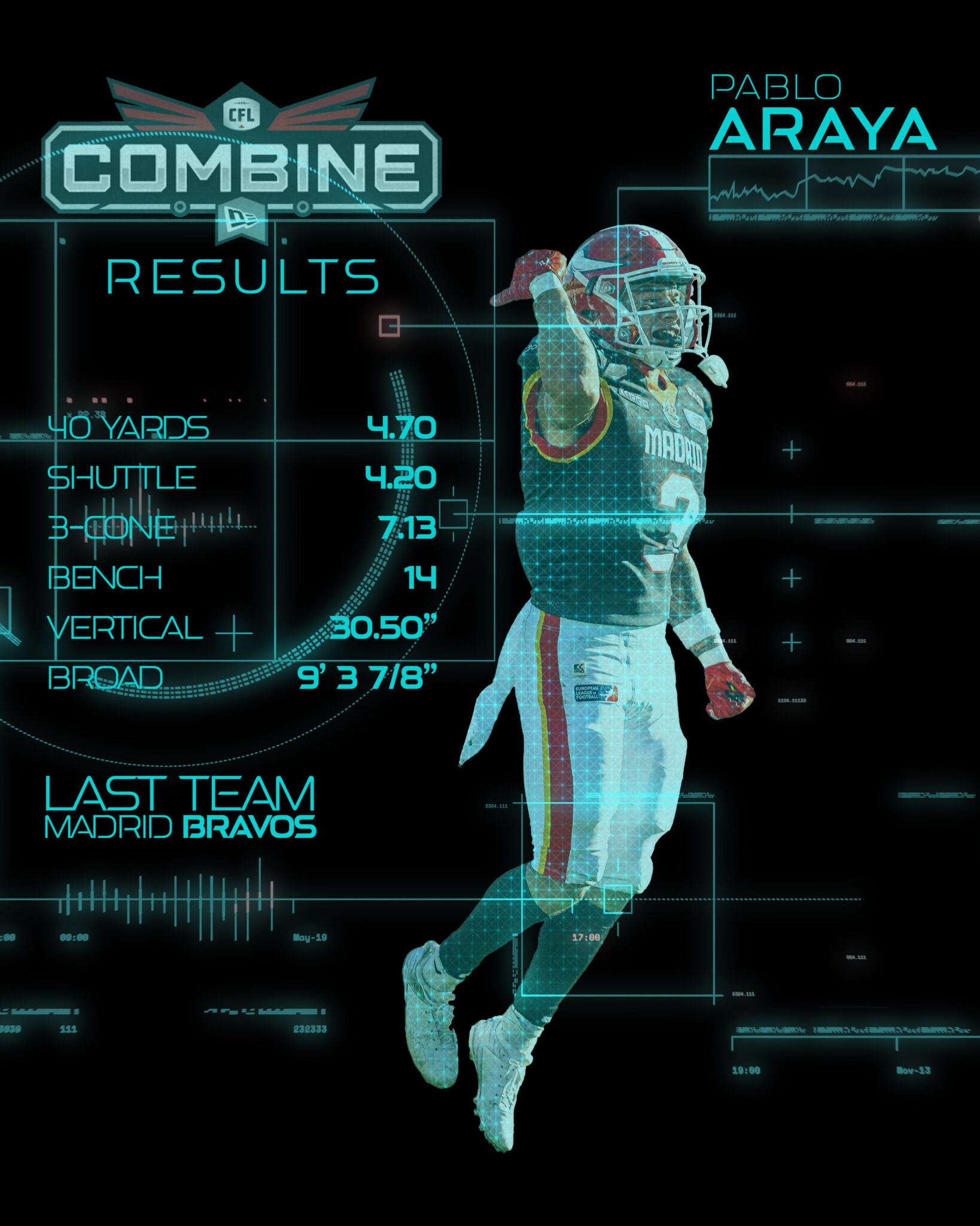 Pablo Araya, the Spanish defensive back, also put in a strong performance at the CFL Combine. With a time of 7.13 seconds in the three-cone drill, he demonstrated his agility and agility. This performance shows that he is able to change direction quickly and move nimbly around the field. Araya had an impressive performance in the ELF last season, recording 99 tackles, including three for loss of space, and three pass defenses in 12 games. He also forced a fumble and recovered another, highlighting his ability to read the game and make crucial plays.
