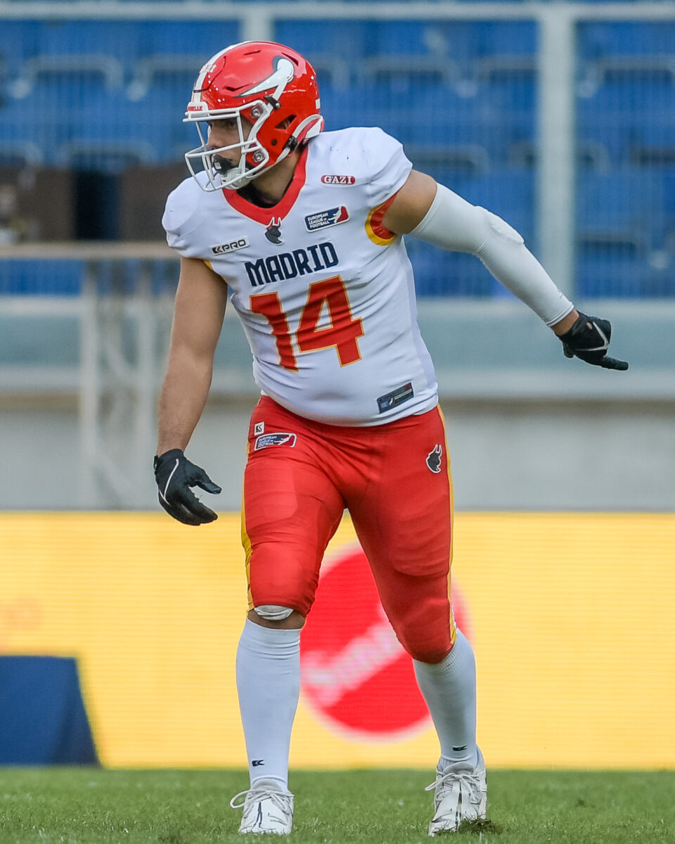 Raul Cernuda (Madrid Bravos, #14), Rhein Fire vs Madrid Bravos, American Football, European League of Football, Wildcard round, Season 2024, 01.09.2024, Foto: Foot Bowl/JUST SHOTS