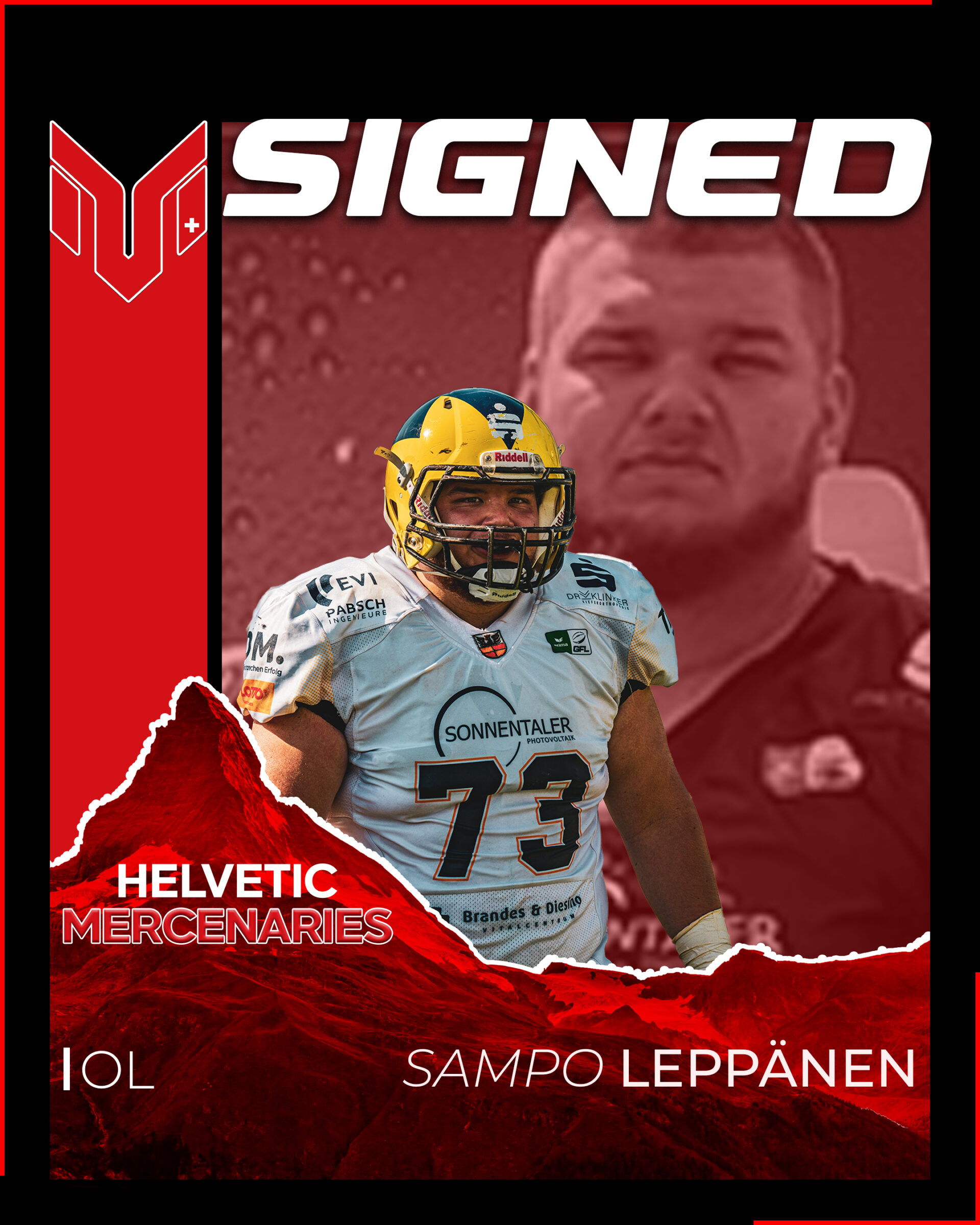 Helvetic MercenariesSampo Leppänen by roman.just-shots24. August 200418. March 20250299 Share0 Timothy SchürmannRemo SpahrNoel LimacherKevin NobelLino UlmiAleksi NärhiLaurin FelixSampo LeppänenKodi KoechliKai Lau WilliamsNoah Schaerli01. Jocques Crawford02. Kobe Miranda3. Marko Ilic04. Aaron Jackson05. Max Mayer06. Hendrik Rutishauser07. Isaiah Weed08. Michael Kimpiabi08. Morten Krispin09. Omar Shah10. Milan Spiller13. Ismael Schmid13. Cayman Bailey Jr14. Osteen Diacoumidis15. Raphael-Justin (RJ) Sagna19. Adrian Saliu20. Enrico Tesan24. Alan Orsetti25. Lennox Gautschi30. Tyrrell Pierre Bovelle40. Yann Hinder55. Mischa Bernard63. Niels Meier77. Otávio Amorim77. Stefán Númi Stefánsson79. Joe Colic80. Gregorio Calonego84. Fabio Häfliger91. Dalibor Vuckovic93. Dylan Bhend99. Steven Hintermann #NameSampo LeppänenNationalityFinlandPositionOffensive LineHeight190cmWeight145kgCurrent TeamHelvetic MercenariesLeaguesEuropean League of FootballSeasons2025Age21