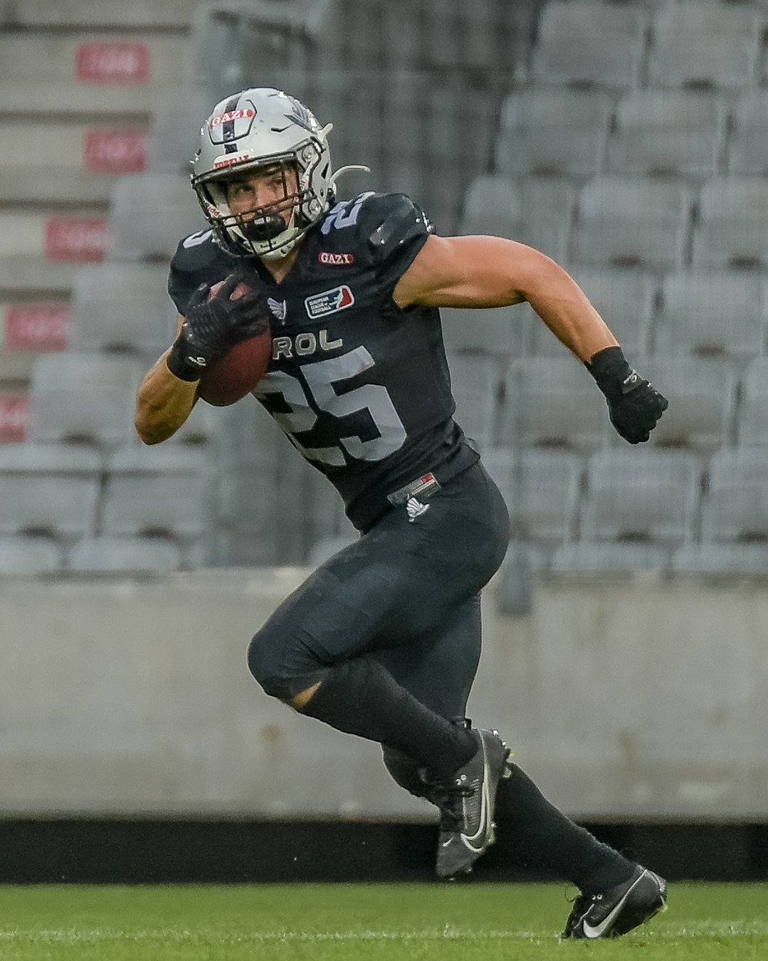 Tobias Bonatti, born on May 18, 1998 in Innsbruck, is an Austrian American football player. With a height of 180 cm and a weight of 90 kg, he plays as a running back for the Raiders Tirol in the European League of Football (ELF). Bonatti began his career with the Swarco Raiders Tirol and has achieved numerous awards and successes, including the title of European Junior Champion and MVP of the 2017 European Junior Championship. He is known for his pass-catching abilities as a running back and has racked up impressive statistics in his career.