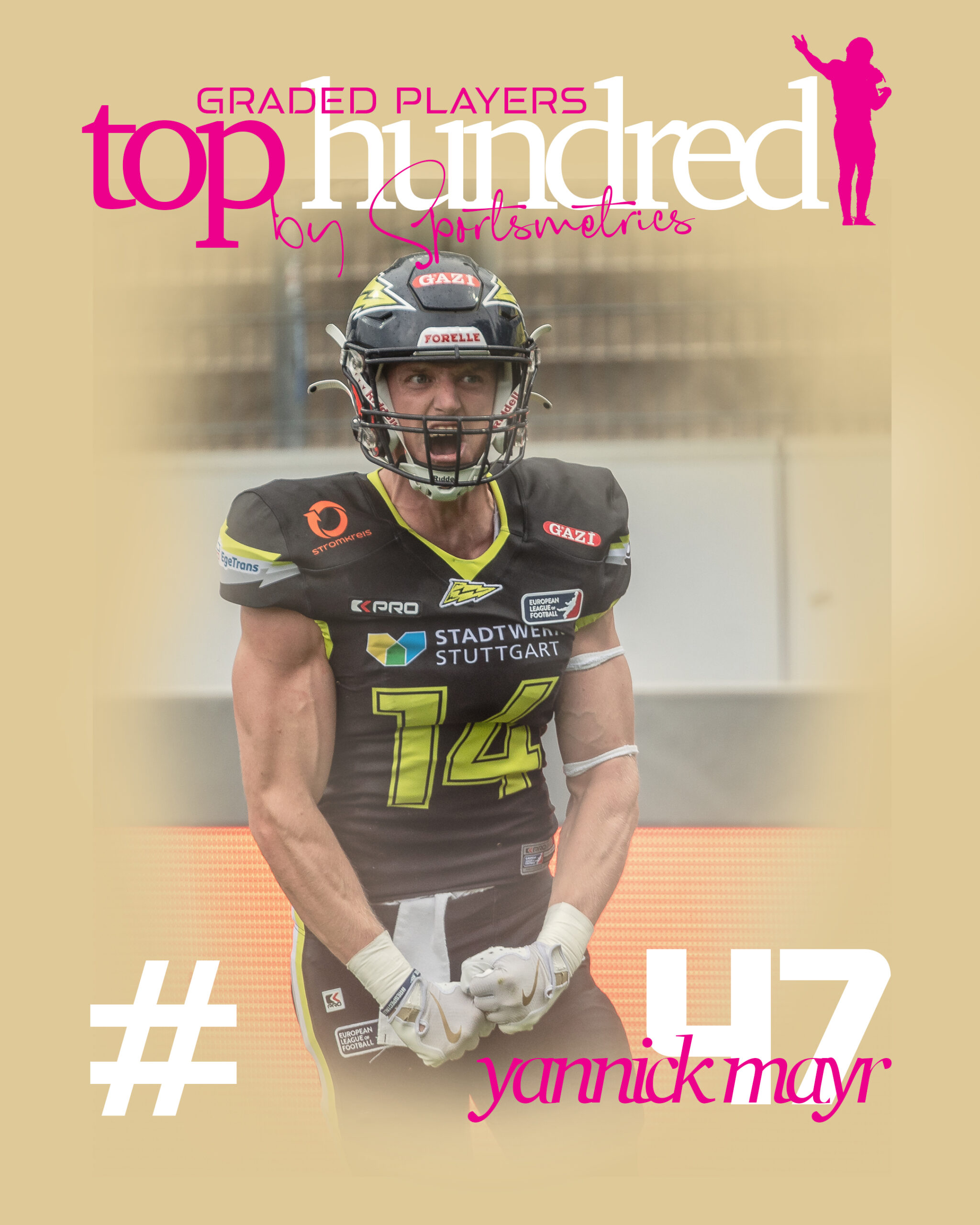 Yannick Mayr, born on March 19, 1996 in Oberndorf near Salzburg, is an Austrian American football player who plays as a wide receiver for the Stuttgart Surge in the European League of Football. With a height of 183 cm and a weight of 87 kg, he has established himself as a versatile player. Mayr began his career with the Salzburg Ducks in 2010 and later played for the Dacia Vienna Vikings and Schwäbisch Hall Unicorns. He is known for his speed and ability to catch deep passes. Mayr has won several awards, including the European Junior Championship title in 2015 and the Austrian Championship title in 2017 and 2020. He also participated in the 2019 NFL International Combine. Mayr has a degree in sports science from the University of Vienna.