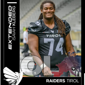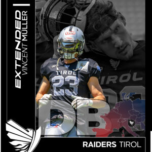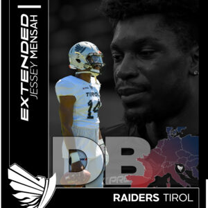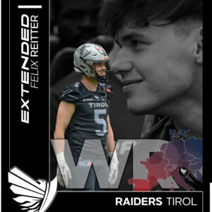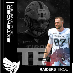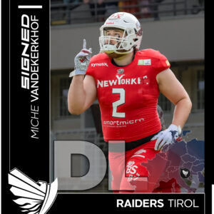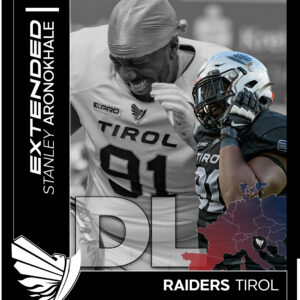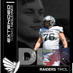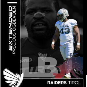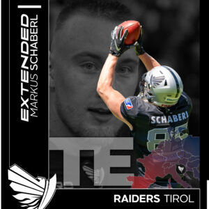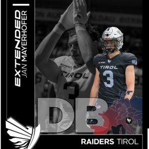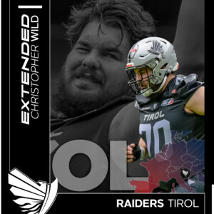 Raiders Tirol by roman.just-shots26. October 202410. October 20250369 Share0 LeaguesEuropean League of Football, South DivisionSeasons2022, 2023, 2024, 2025, 2026HomeInnsbruck Tivoli Stadion NameRolleAlterTerry Malone Assistant Head Coach65 QB1 18 Conor MillerWide Receiver Benni Radauer Simon Stockhammer Bruno Escobar 04 Marco Schneider 5 Felix Reitter 09 Jacorey Sullivan 10 Adrian Platzgummer 10 Philipp HaunTight End Theo Mössinger 85 Markus Schaberl 87 Richard WeberRunningback Jan Wiesauer Tim Tonko 22 Philipp Timmermann 24 Lukas Haslwanter 25 Tobias BonattiOffensive Line William Nwankwo Tommaso Romito Tobias Haslehner 70 Christopher Wild 74 Isaiah Kleberg 76 Jonathan PepplerOffensive Tackle 70 Tobias RodlauerLinebacker Lukas Lampert 01 Ruben Seeber 43 Precious Ogbevoen 45 Sebastian HuberOutside Linebacker 33 Tim UngerDefensive Line Stanley Aronokhale Fabian Egger Lukas Wittberger Pietro Manicardi Miche Vandekerkhof Dobpson Hopson 51 Phillip Louis Löffelberger 90 Dušan Novaković 97 Diego PazDefensive Back Aaron Maddox Dijion Walls 27 Mato BeglarianCornerback 21 Lukas Kalkhofer 82 Milan FabySafety 3 Jan Mayerhofer 23 Vincent MüllerKicker/punter 37 Sandro EggerReturner 23 Vincent Müller